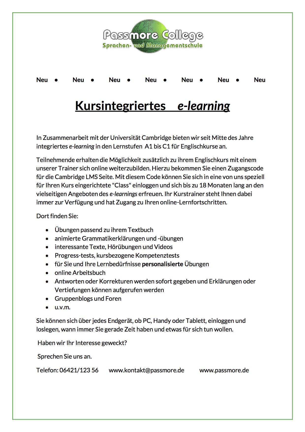 Liebe Freunde, haben Sie Interesse sich zusätzlich zu Ihrem Englischkurs weiterzubilden? Jetzt haben Sie die Möglichkeit! In Zusammenarbeit mit der Universität Cambridge können wir jetzt integriertes E-Learning anbieten. Schauen Sie sich unser Infoblatt an, um sich über alle Vorteile von integriertem E-Learning zu informieren. Ihr Passmore College Team |